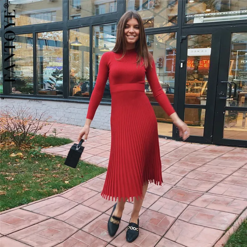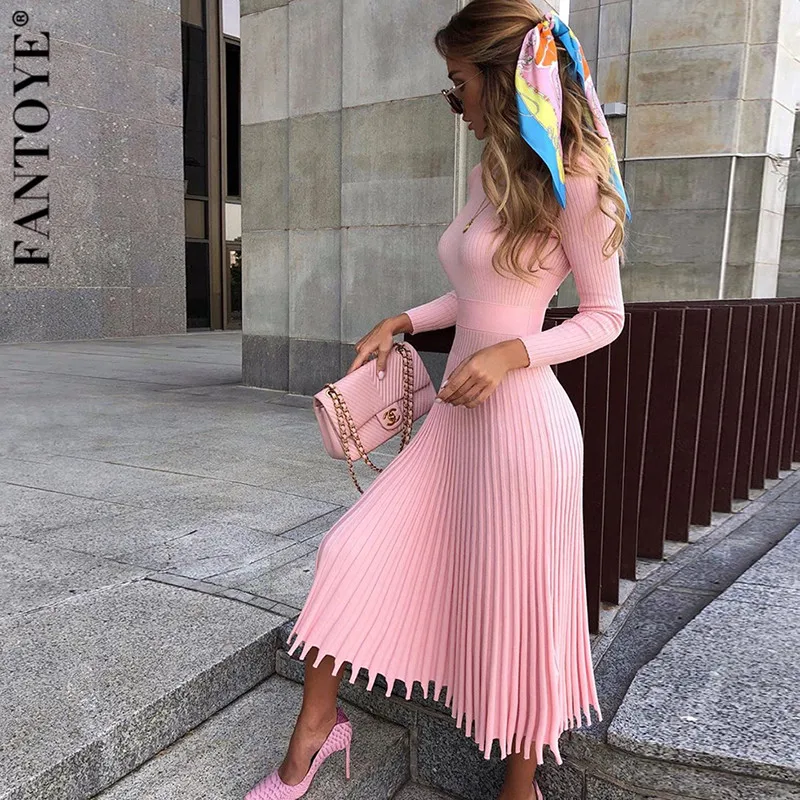 Good Product FANTOYE Women Autumn New Knitted Long Dress Ribbed Elegant Midi Bodycon Sweater Dress Official Ladi