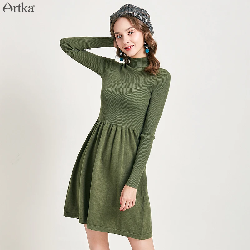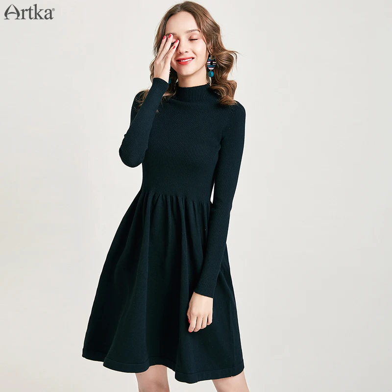 Cheap ARTKA 2019 Autumn Winter New Women Dress Elegant Solid Color Wool Knitted Dresses Turtleneck Long S
